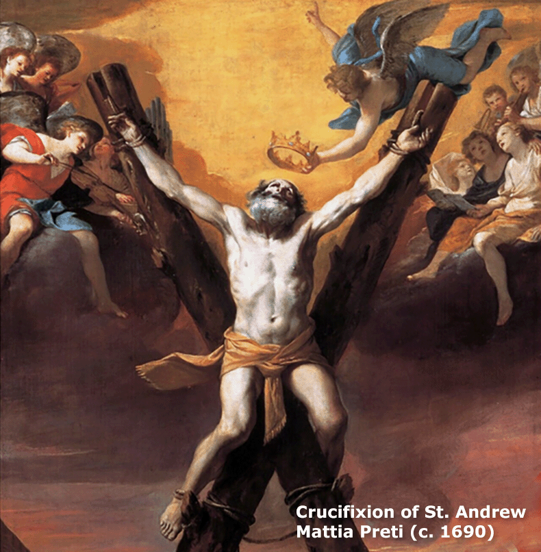 The association with Saint Andrew develops in the late medieval period. The tradition according to which this saint was crucified on a decussate cross is not found in early hagiography. Depictions of Saint Andrew being crucified in this manner first appear in the 10th century, but do not become standard before the 17th century.