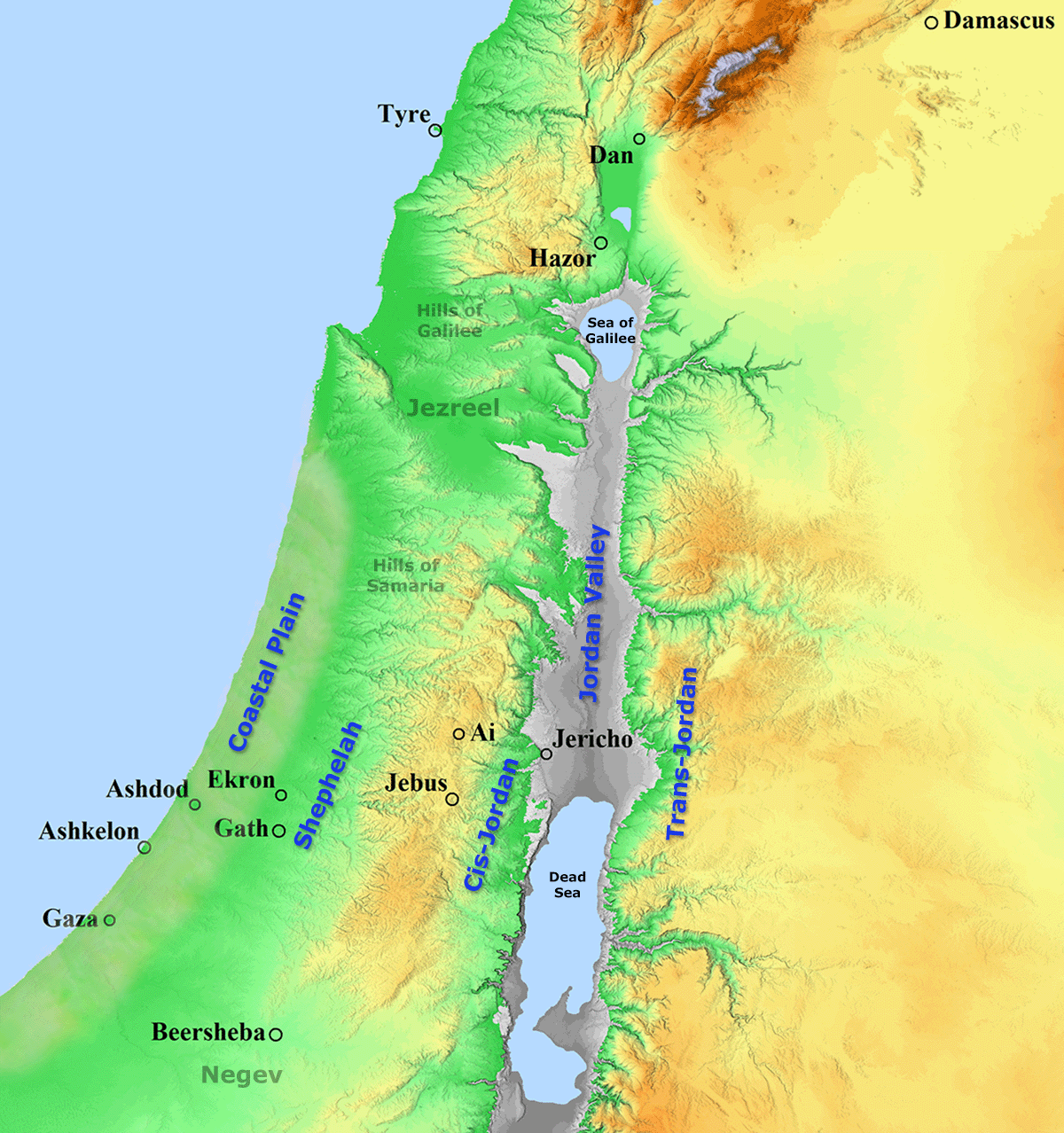 Moving eastward, one next comes to the zone known as the Shephelah. Located about twenty miles inland, the Shephelah ("lowlands") consists of foothills leading from the Coastal Plain to the hill country of the Cis-Jordan. In between the foothills are valleys of various sizes that provide fertile crop-land and local trade routes. The Cis-Jordan is the next longitudinal zone toward the east. "Cis-Jordan" is Latin for "this side of Jordan," (reckoned from Jerusalem). It was the land along the western bank of the Jordan River. (Later, Cis-Jordan came to be used as a term for the entire area ranging from the western bank of the Jordan River to the Mediterranean Sea).