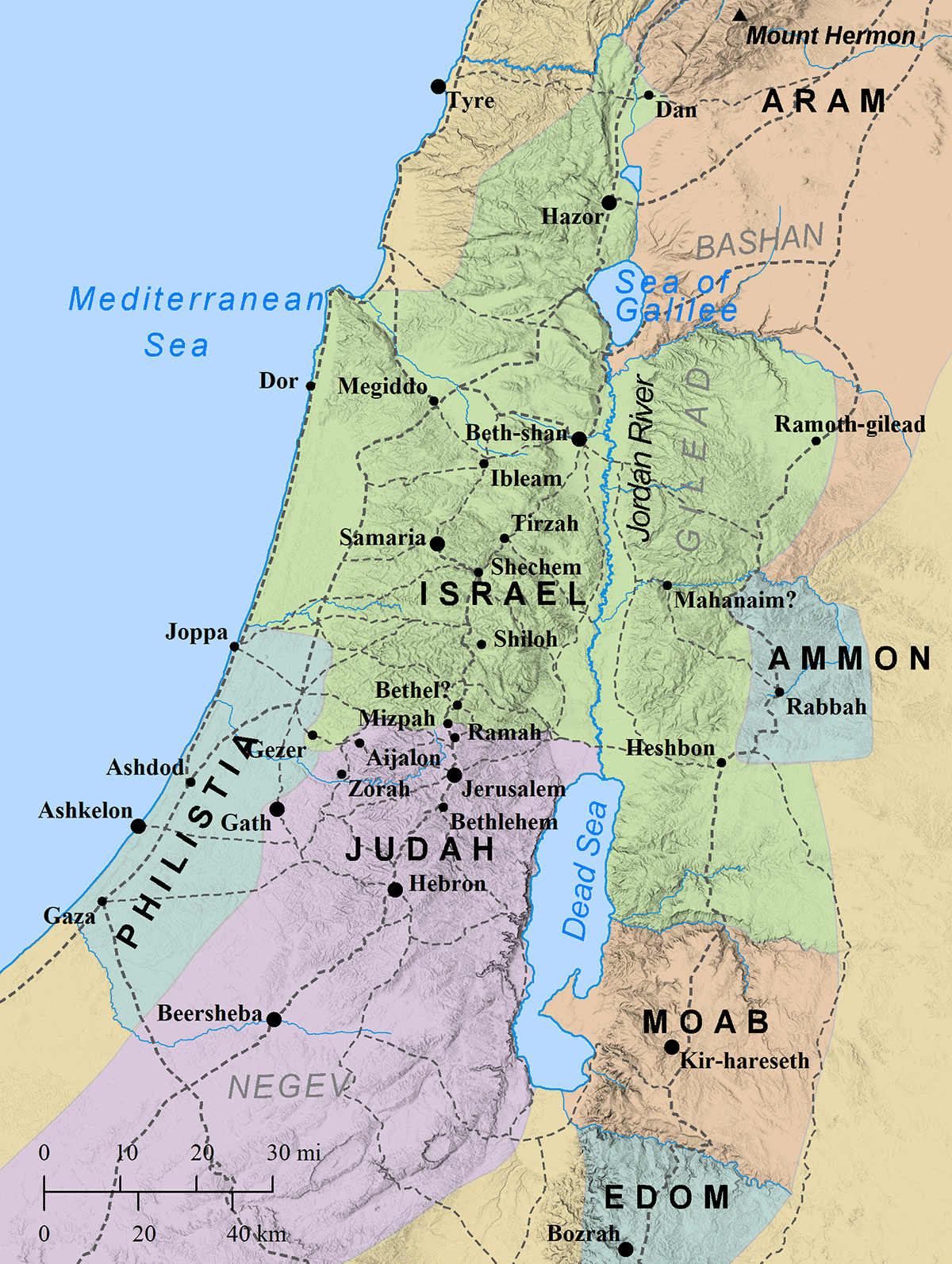 Within the Cis-Jordan is the hill country that is further broken up by two east-west valleys: the Jezreel/Esdraelon Valley in the northern part of the country, and the Negev of Judah in the south. The hill country divisions are the following: in the north, the Hill Country of Galilee , in the middle (mid-north) the hill country of Samaria/Ephraim, in the middle (mid-south), the hill country of Judah and the Wilderness Highlands in the south. The majority of the events that the Hebrew Bible describes were set in the Shephelah and the hill country of the Cis-Jordan.
