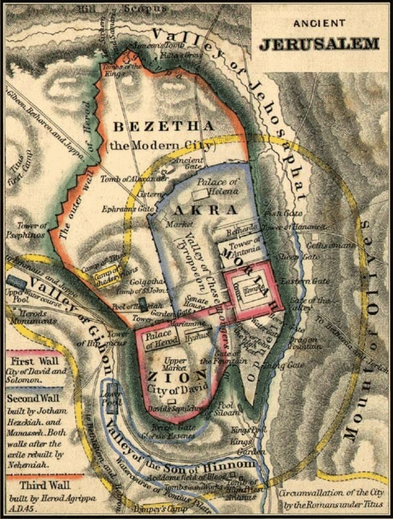 Mount Bezetha is north of the Antonia Fortress and was not a part of the city of Jerusalem until the mid-first century AD. The so-called "Third Wall" of Josephus was begun by Herod Agrippa in AD 44, but was not completed until the Jewish rebels did so in AD 66. The areas enclosed by this wall were called the "New City."