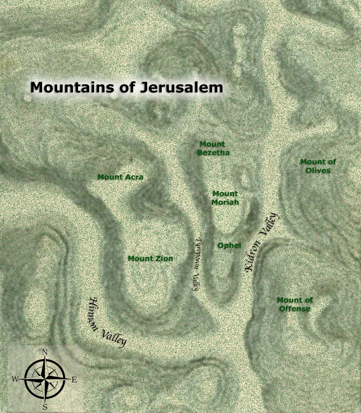 The greater city rested on top of four mountains, (hills actually), two of which have the biblical names of Mount Zion and Mount Moriah. Between these two hills was a valley that the Romans called the Tyropoeon. Zion was basis of the south-western part of the city and was the largest of the hills. Although the word "Zion" often referred to this hill in the old Testament, it also occasionally referred to Moriah or the greater city in general. The stronghold of the Jebusites that was on Mount Zion was taken by David, and thereafter in the Psalm he told of God's choice of Zion...