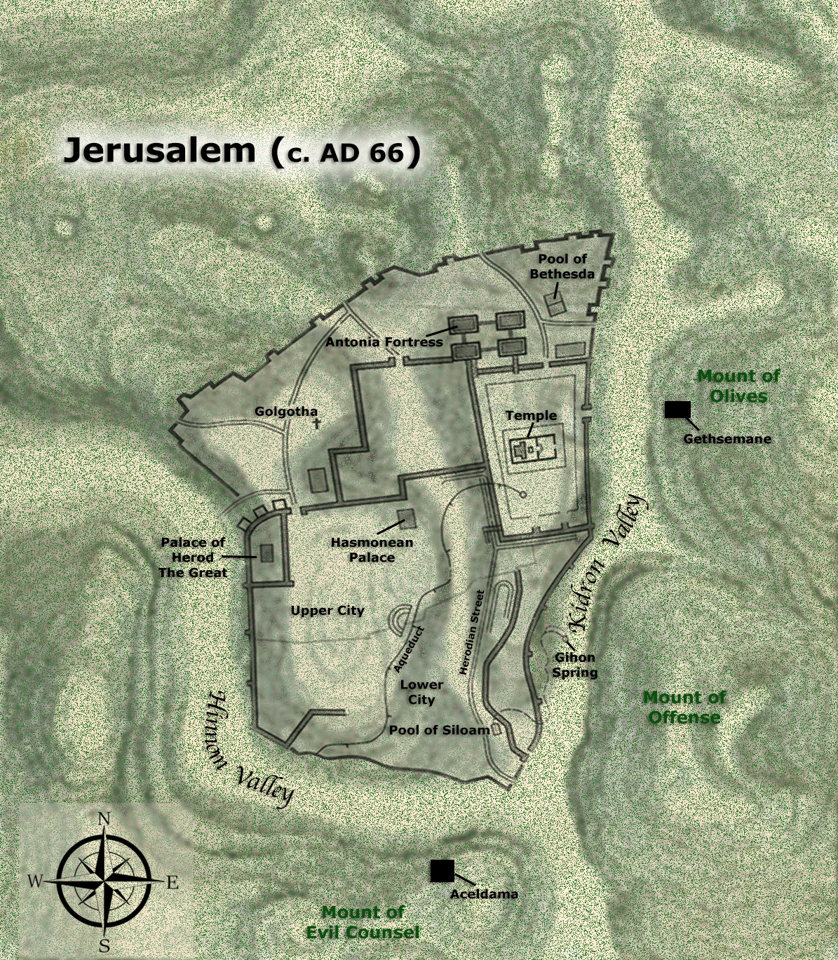The eastern valley of Kidron was also known as the "Valley of Jehoshapat." It separated the city from the Mount of Olives. The Tyropoeon Valley joined Kidron south of Mount Moriah and ran north between Zion and Moriah. The Hinnom Valley created the western and southern protection for the city. Its southern-most part was called "Gehenna," (or "Tophet"). This was a "place of fire" lamented by the prophet Jeremiah as the location wherein Moloch was worshiped with the abomination of human sacrifice, (Jeremiah 7:31). In New Testament times, Gehenna had become a huge, foul garbage heap of excrement with the carcasses of animals and the bones of unclaimed dead. Because of its history and foul nature, the term Gehenna became associated with divine punishment, or "hell."