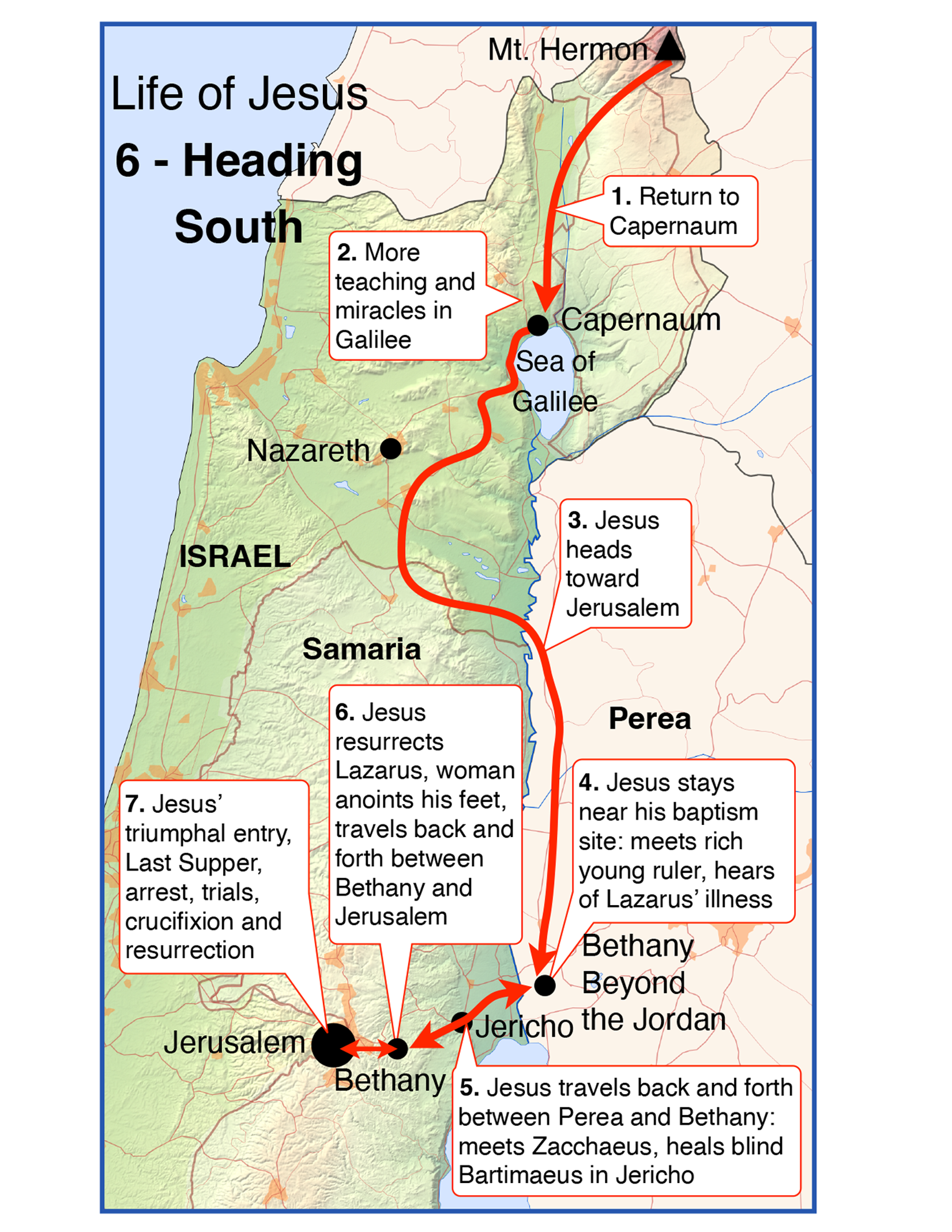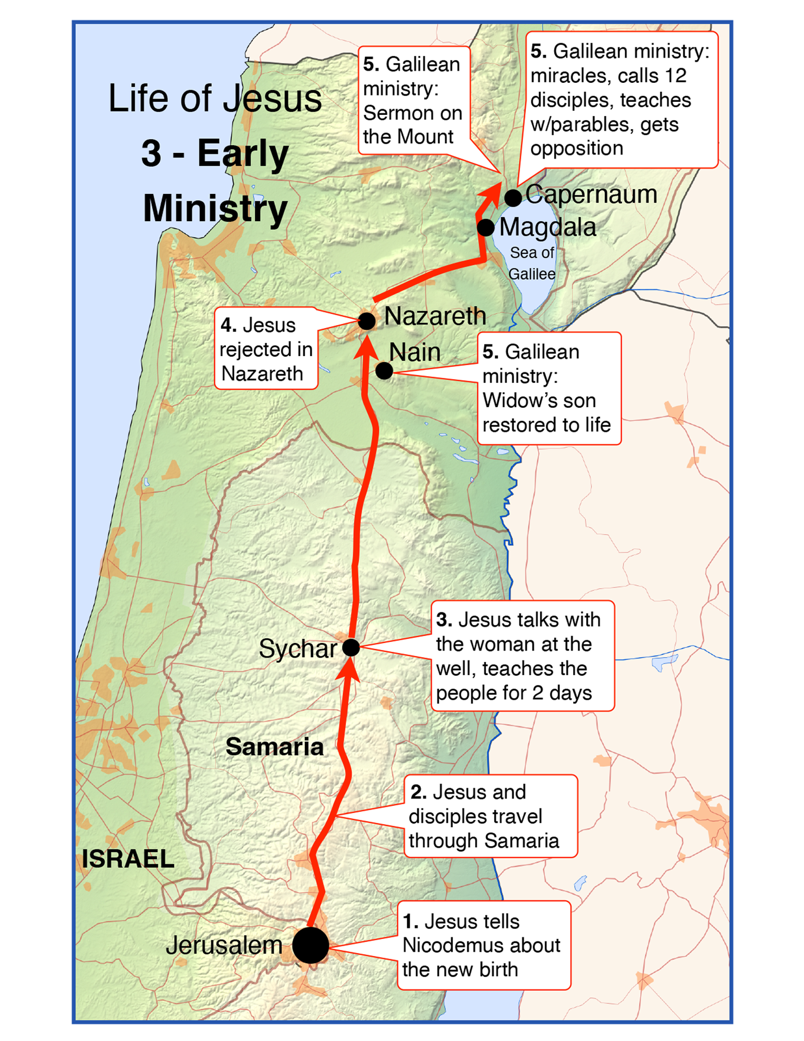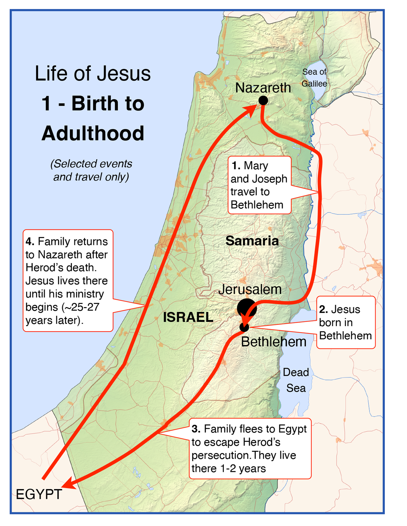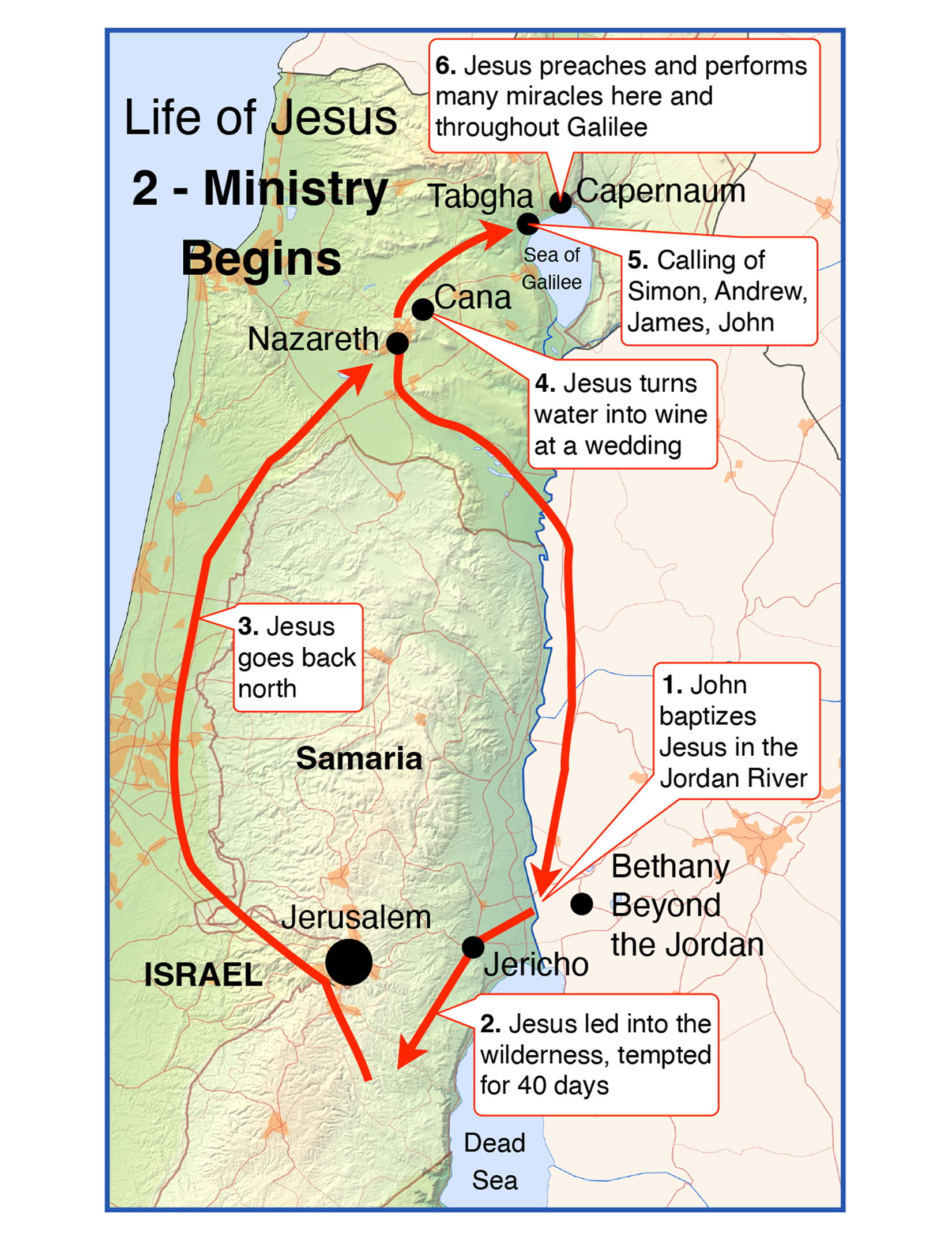Jesus, now about 30 years old, travels away from his home-town of Nazareth in Galilee Luke 3:23